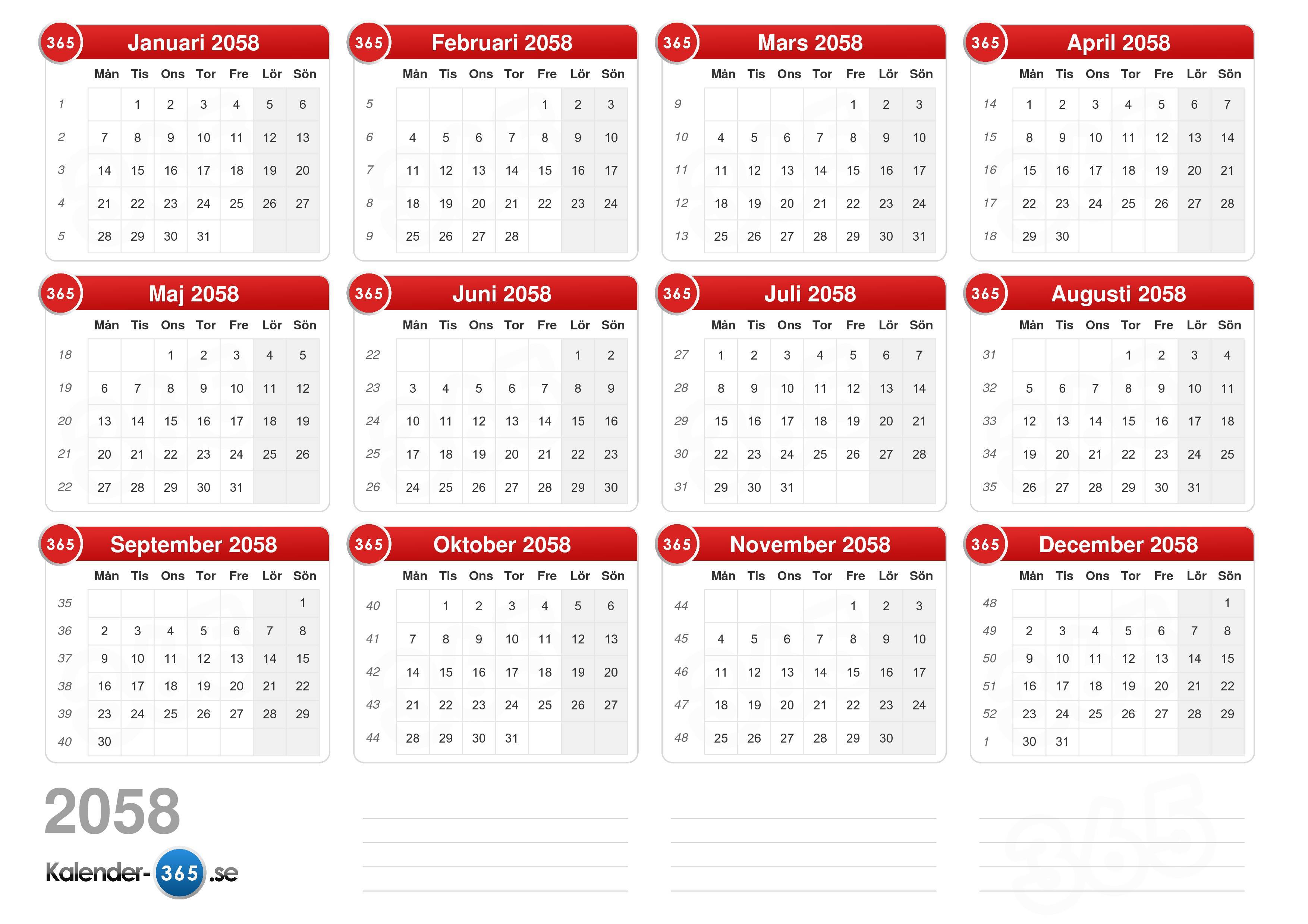 Hent kalender 2058 med helgdagar. (Liggande format - 1 Sida)
