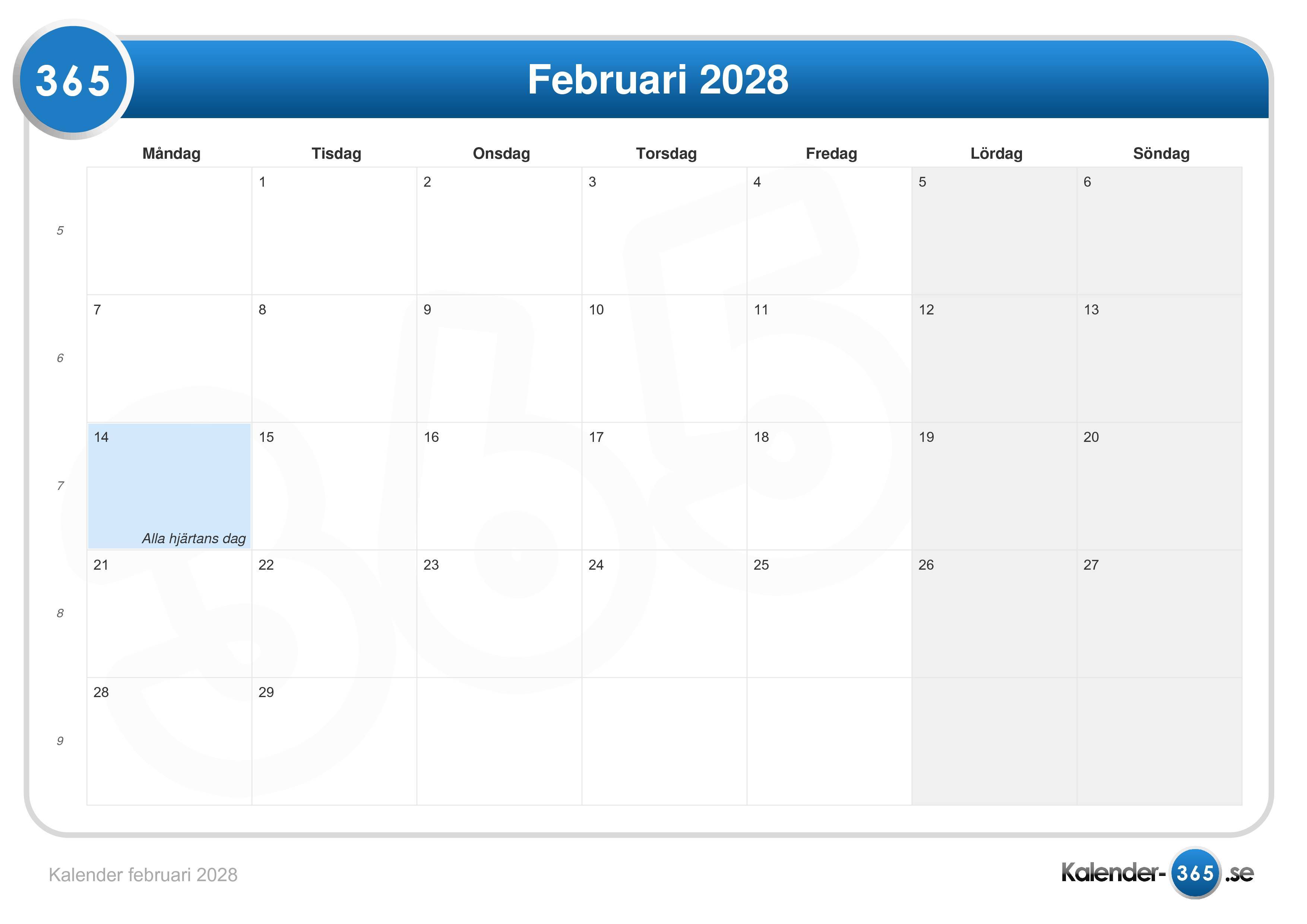 Här kan du se månadskalender för februari 2028 inklusive veckonummer.| Vecka | Må | Ti | On | To | Fr | Lö | Sö |
