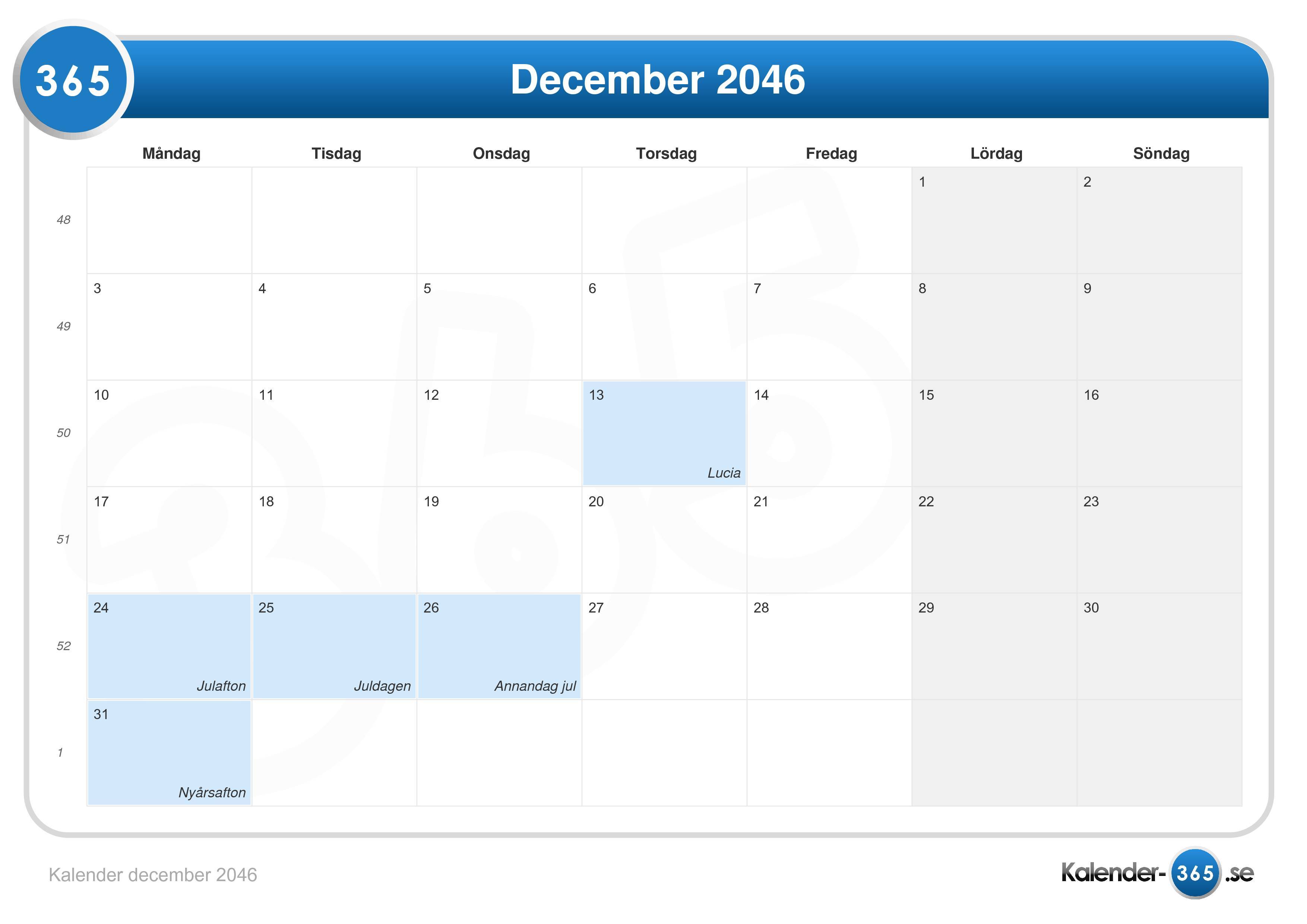 Denna december 2046 kalender är alltid praktisk att använda om du till exempel vill räkna ut när du har semester.
