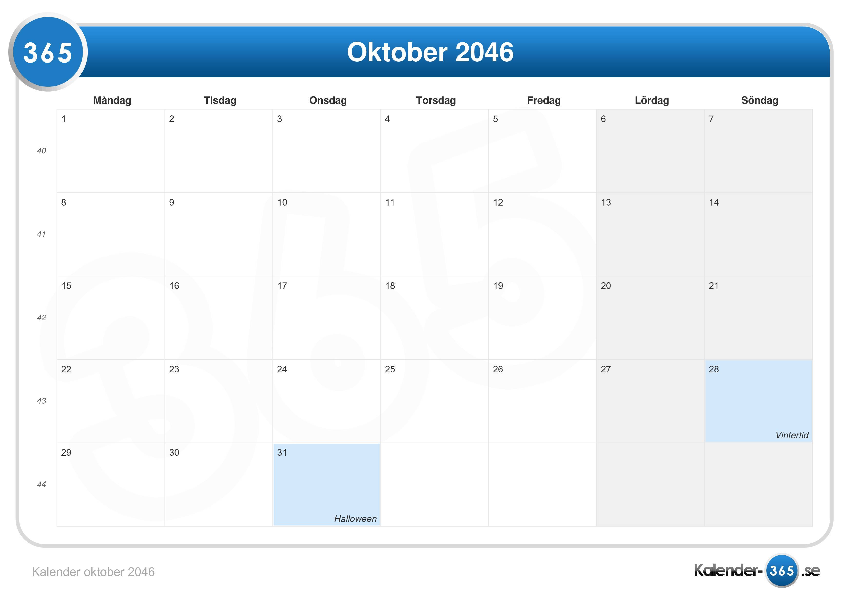 Här kan du se månadskalender för oktober 2046 inklusive veckonummer.| 28 oktober | Vintertid |